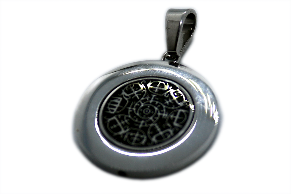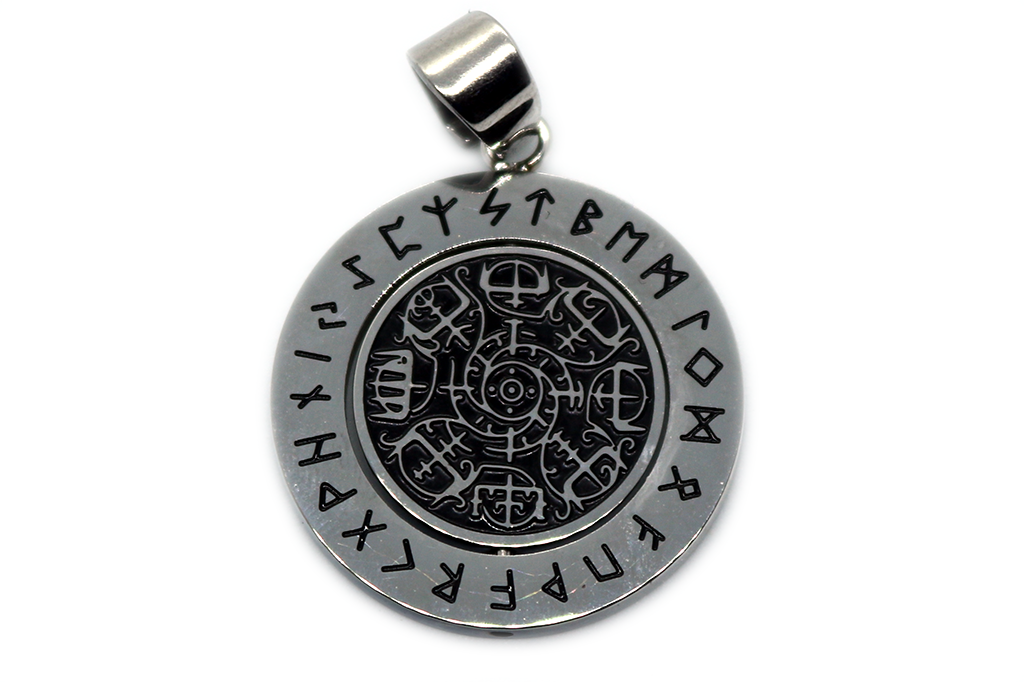 Made from quality Stainless Steel. A stunning Pendant/Amulet from Steel Harbor. Pendant ONLY – Chains SOLD SEPERATELY. This piece can accommodate chain widths of 4mm or less. The ‘bail’ is the ‘hole’ provided on the pendant for the chain. A vegvísir (Icelandic for ‘wayfinder’ oor ‘Compass’) is an Icelandic magical stave intended to help the bearer find their way through rough weather. The symbol is attested in the Huld Manuscript, collected in Iceland by Geir Vigfusson in Akureyri in 1860. Also known or referred to as ‘The Runic Compass’ or ‘The Viking Compass’, the Vegvisir is often used in modern pagan and heathen esoteric work. It is noted the Vegvisir is not an authentic Viking Symbol but in fact originated after the Viking age. “Carry this sign with you and you will not get lost in storms or bad weather, even though in unfamiliar surrounds.”